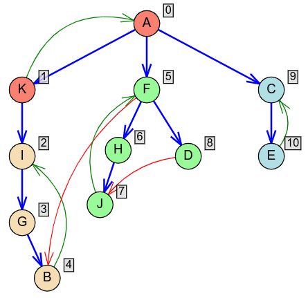 Da bi se za čvor \(F\) ustanovilo da se može vratiti u čvor \(A\) sa rednim brojem \(0\) potrebno je, između ostalog, da vidimo granu \((J,A)\), što se dešava tek pred kraj DFS obilaska, nakon što je obilazak čvora \(F\) završen. Ovo ukazuje na to da je za određivanje najnižeg čvora u komponenti do kog se može stići (što je uvek bazni čvor) potrebno više puta obilaziti graf. Videćemo da to nije slučaj sa vrednostima \(L(v)\) i da se one mogu lako odrediti tokom jedinog obilaska grafa koji vrši Tardžanov algoritam.